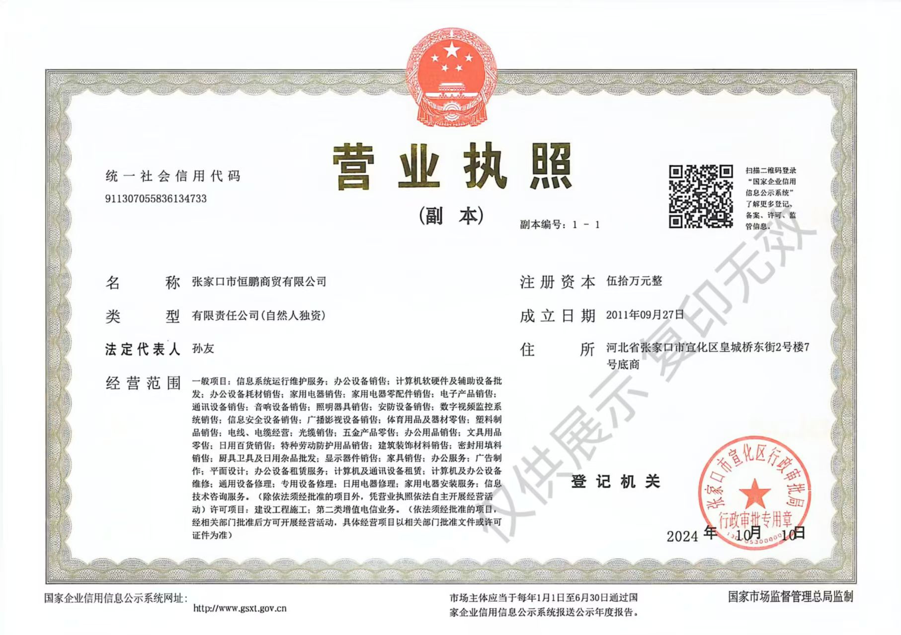 張家口市恒鵬商貿(mào)有限公司于2011年9月27日在張家口市宣化區(qū)工商局登記注冊。我公司的辦公地址位于張家口宣化區(qū)皇城橋東街2號樓7號底商,營業(yè)面積90余平米,倉儲(chǔ)面積100平米,我們有好的產(chǎn)品和*業(yè)的銷售和技術(shù)團(tuán)隊(duì),在公司發(fā)展*大的7年里,本著*質(zhì)量產(chǎn)品,*品質(zhì)服務(wù)的經(jīng)營理念,贏得了市場的認(rèn)可和客戶的信任。先后與張家口地區(qū)各大企事業(yè)單位建立了良好的合作關(guān)系。